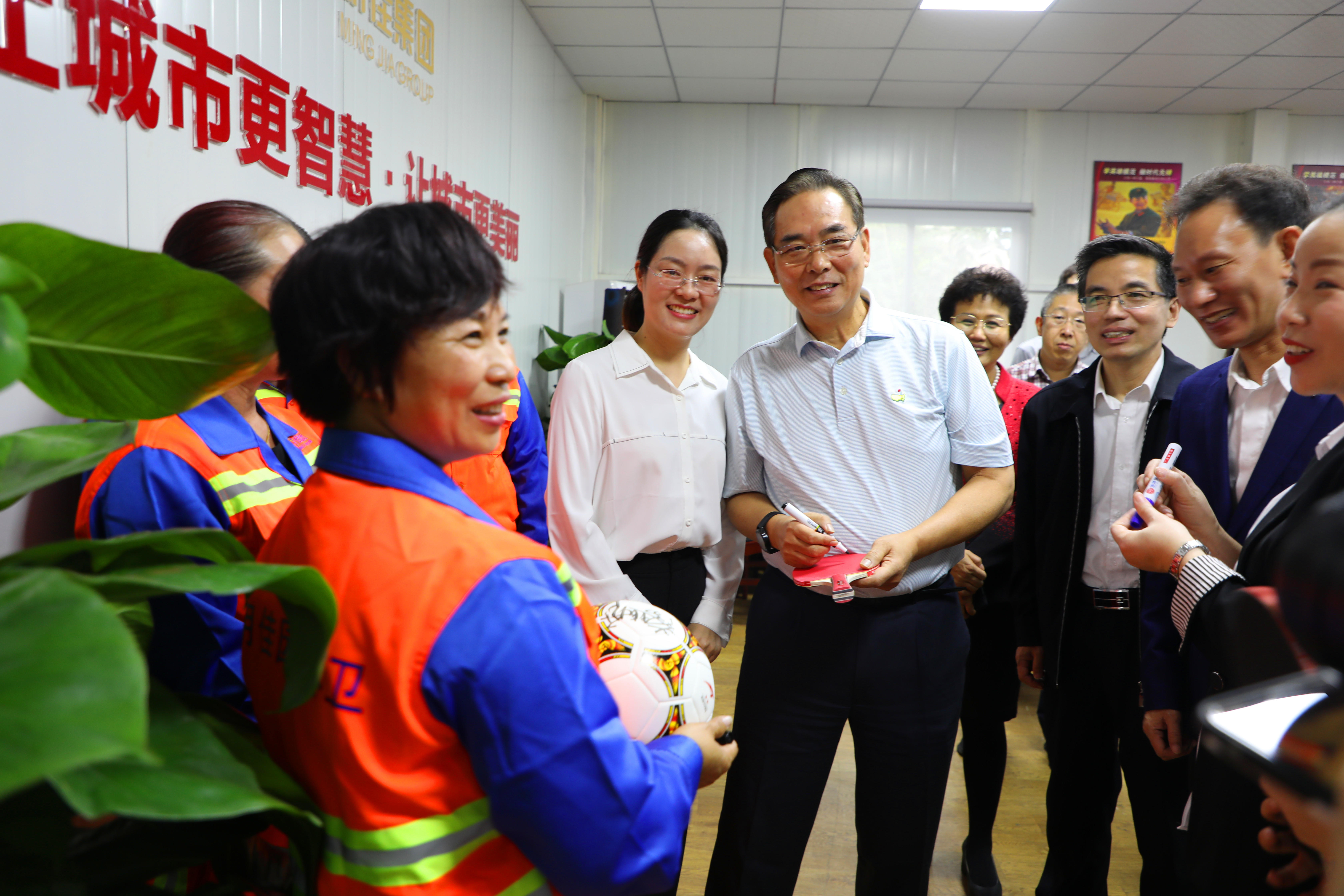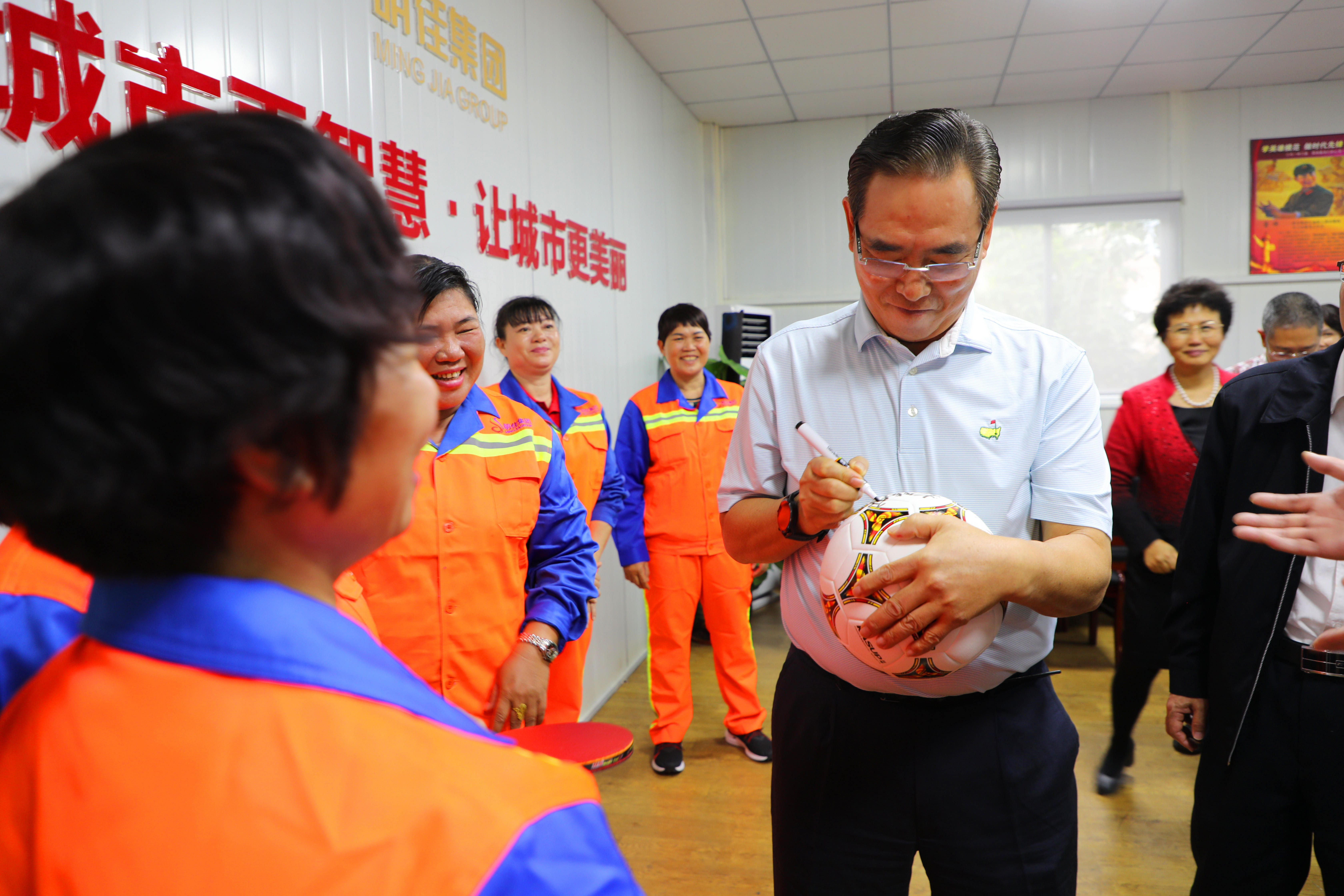 座談會結束后,明佳集團一些職工表示非常喜愛乒乓球及足球運動,一直都是蔡副主席的粉絲,希望獲得蔡振華副主席的親筆簽名。蔡副主席非常親切地為他們簽名,并與之合影留念。